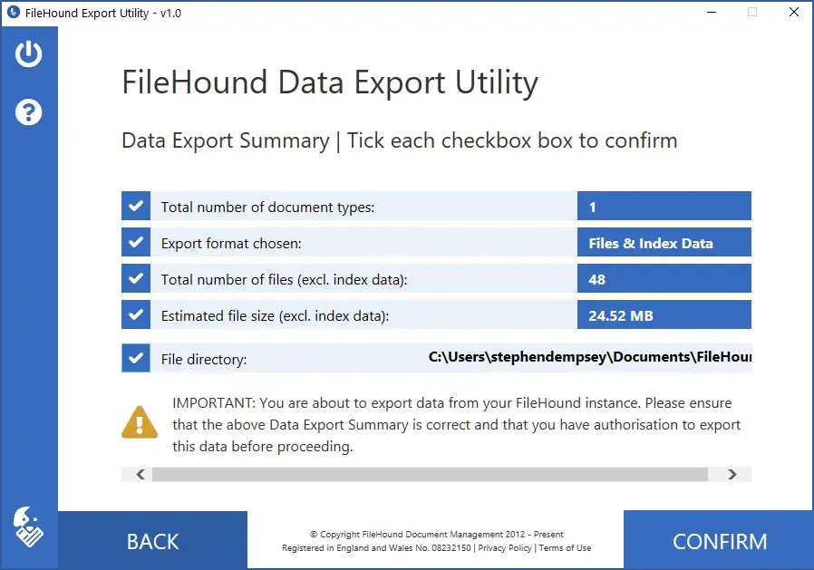 O Utilitário de Exportação FileHound permite os admnistradores FileHound a capacidade de executar um documento seguro e extração de tarefas para um backup alternativo. Esta aplicação irá baixar todos os documentos e/ou meta dados salvos no FileHound com base nos filtros que você escolher. Os metadados serão exportados em ambos os formatos JSON e XML.
